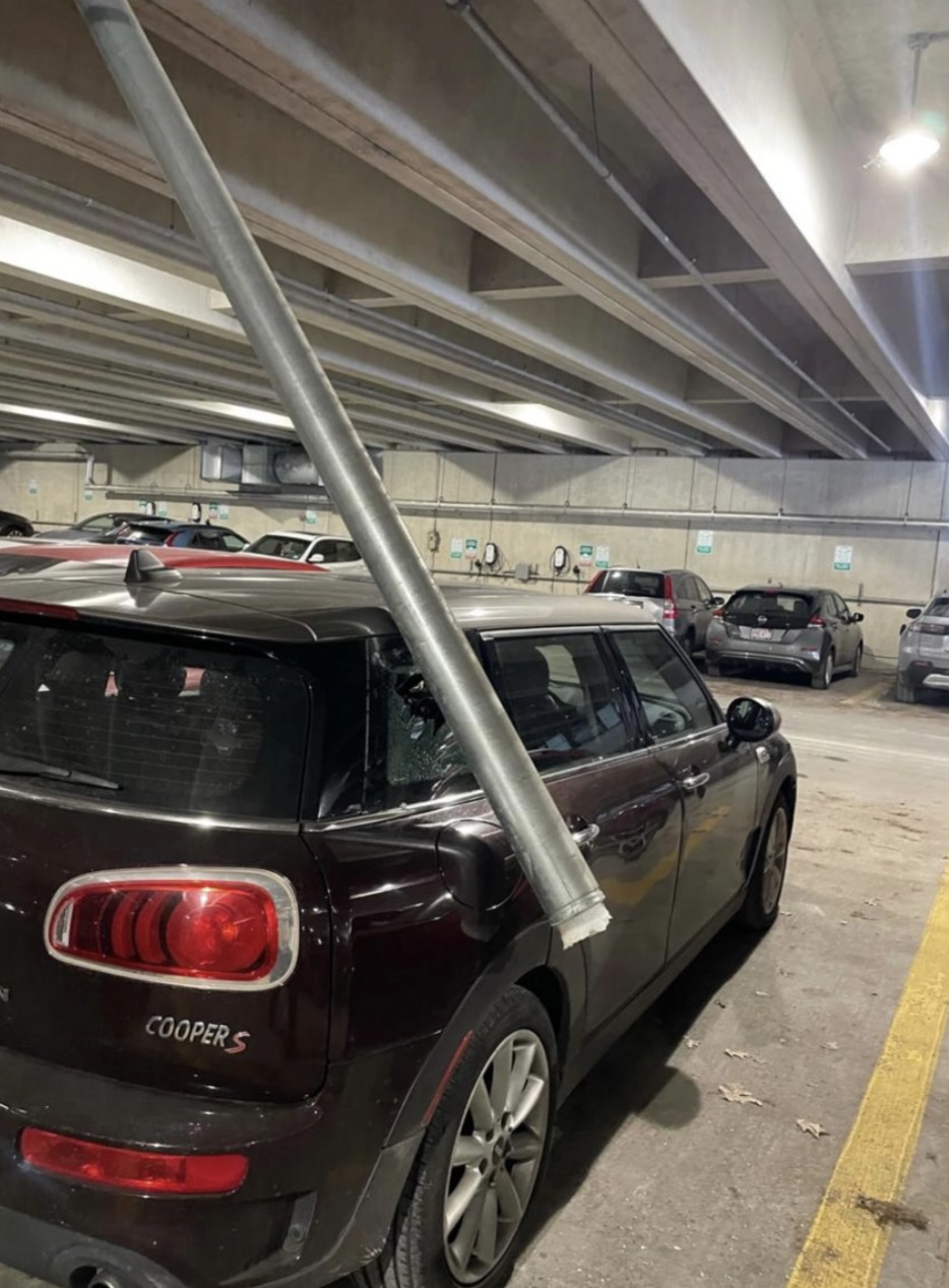 U nedjelju, 25. siječnja, dogodio se neobičan incident na najnižoj razini parkirališta u Davisovoj garaži. Slomljena cijev prskalice uzrokovala je značajnu štetu na vozilu koje je bilo parkirano ispod. Ovaj incident pažljivo je zabilježen u izjavi Pomoćnika potpredsjednika za upravljanje objektima i planiranje, I. Rodericka.