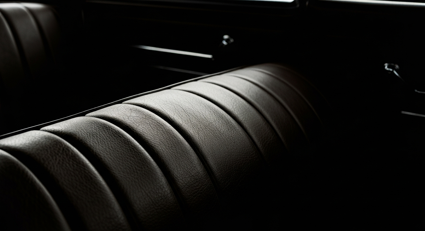 Ekstremno krupna fotografija koja prikazuje bogatu, šljunčanu teksturu kožne unutrašnjosti vozila Honda, dramatično osvijetljenu kako bi se istaknuli prirodni uzorci i boje materijala.
