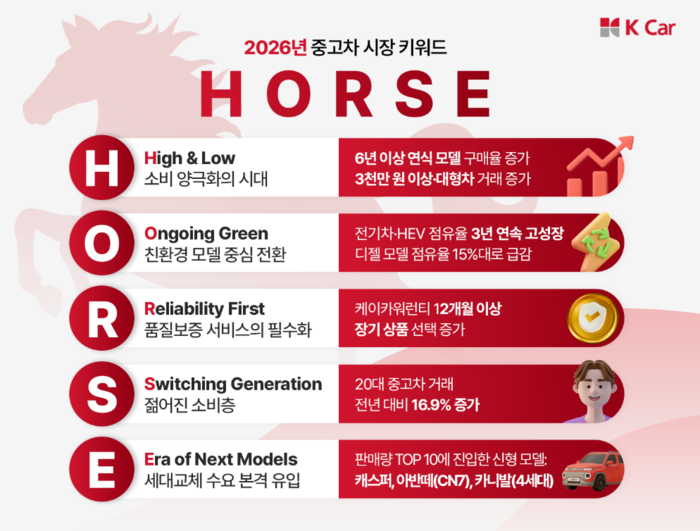 K Car, najveća nacionalna izravno upravljana platforma za rabljene automobile, objavila je 19. prosinca identificiravši ‘KONJ’ kao ključni trend za tržište rabljenih automobila u 2026. godini, na temelju ovogodišnjih podataka o prodaji. Pet ključnih riječi uključuje: High & Low (polarizacija u potrošnji rabljenih automobila), Ongoing Green (rastuća potražnja za ekološki prihvatljivim modelima), Reliability First (suspicion na jamstvene usluge), Switching Generation (mlađa baza potrošača) i Era sljedećih modela (priljev vozila sljedeće generacije).