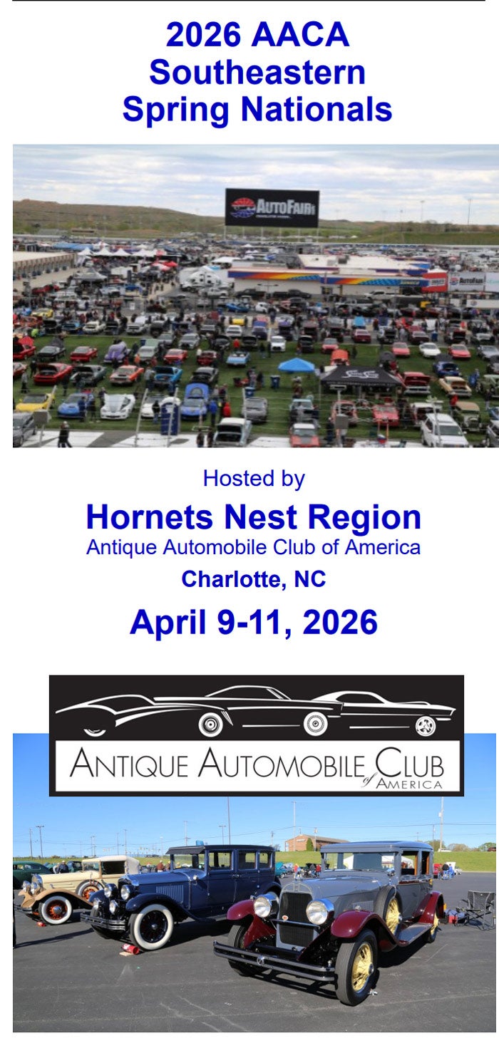 Regija gnijezda stršljenova izražava srdačnu dobrodošlicu svim kolegama članovima AACA-e koji prisustvuju Southeastern Spring Nationals. Travanj je savršeno vrijeme za posjet Charlotte i svima bi nam bilo posebno drago da nas posjetite ove godine.