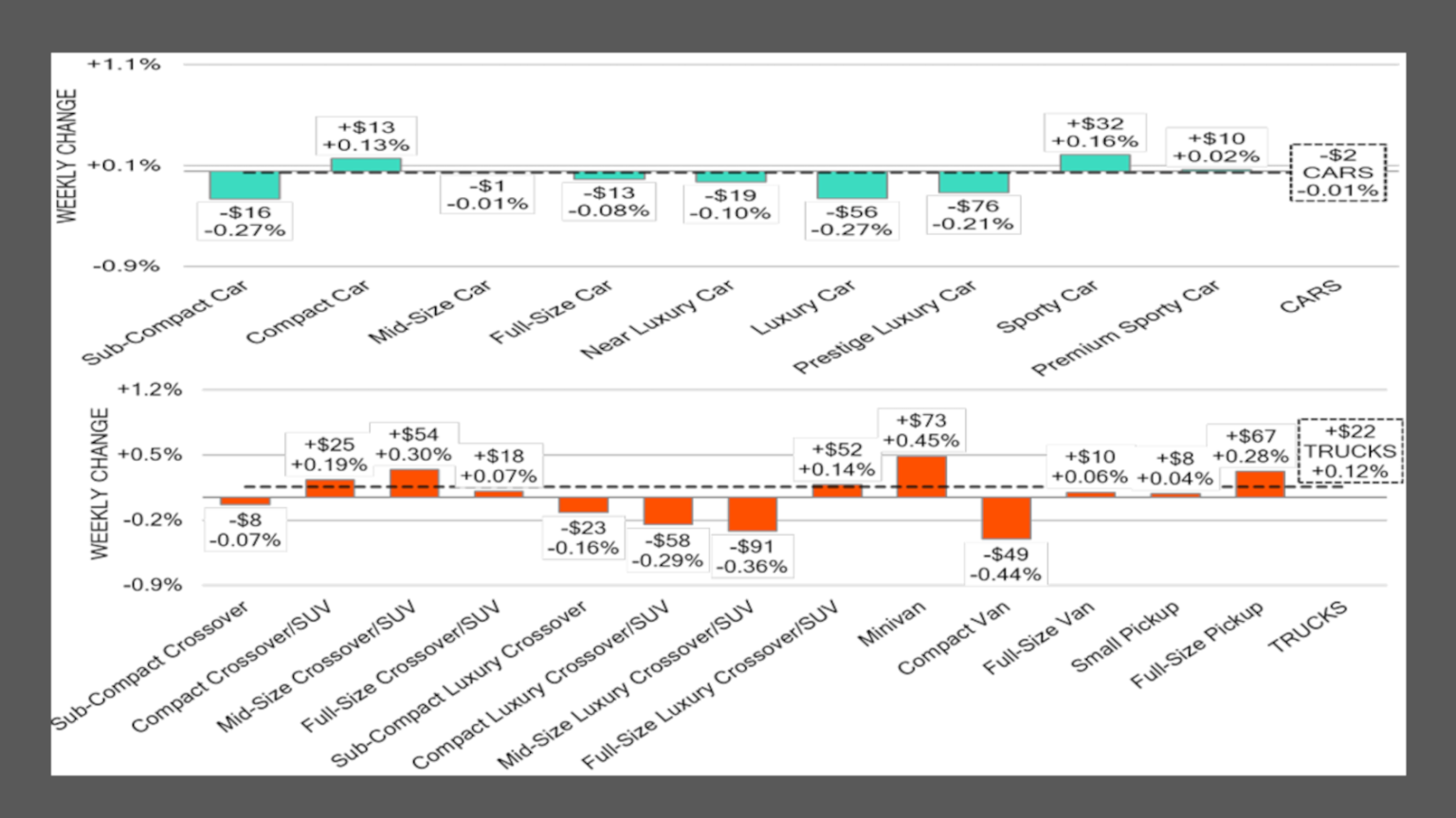 Gledajući specifične segmente vozila, Black Book je primijetio da su vrijednosti automobila starijih od 2 godine porasle za 0,26%. Pritom su automobili stari između 8 i 16 godina doživjeli pad cijene od 0,17%. Oskudna ponuda i rastuća potražnja povećali su vrijednosti vozila pune veličine mlađe od 2 godine za 1,04%.