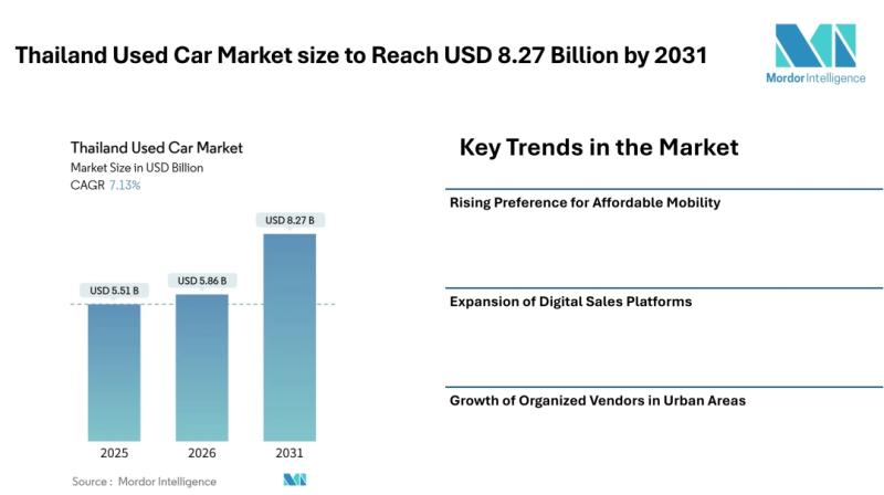 Prema izvješću Mordor Intelligence, tržište rabljenih automobila u Tajlandu procijenjeno je na 5,51 milijardu USD do 2025. godine. Očekuje se da će porasti na 8,27 milijardi USD do 2031. godine, uz godišnju stopu rasta (CAGR) od 7,13% tijekom predviđenog razdoblja. Ovaj rast u velikoj mjeri odražava promjene u potražnji uzrokovane povećanom brigom o proračunu i strožim kriterijima odobravanja kredita za automobile.